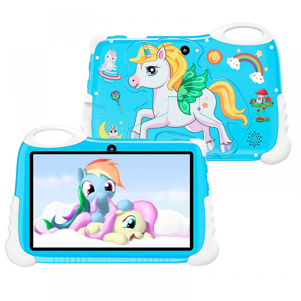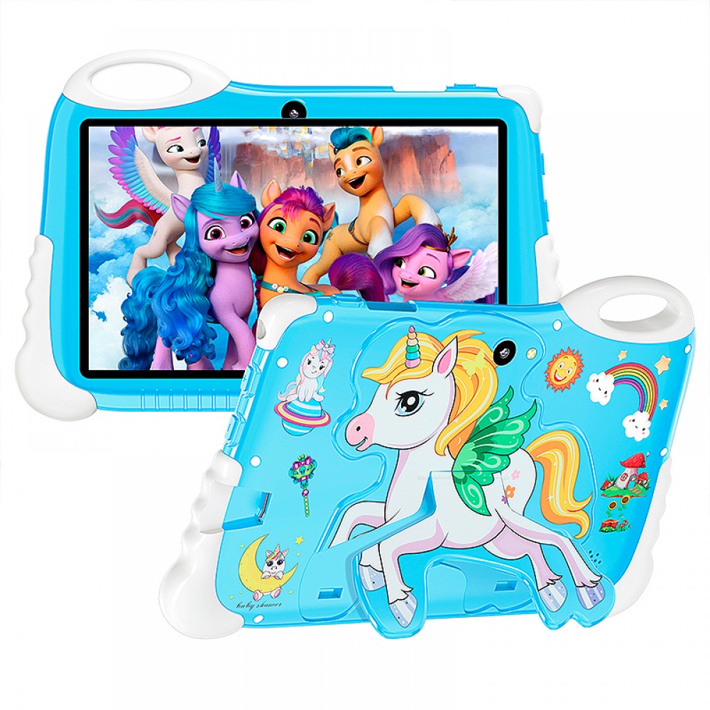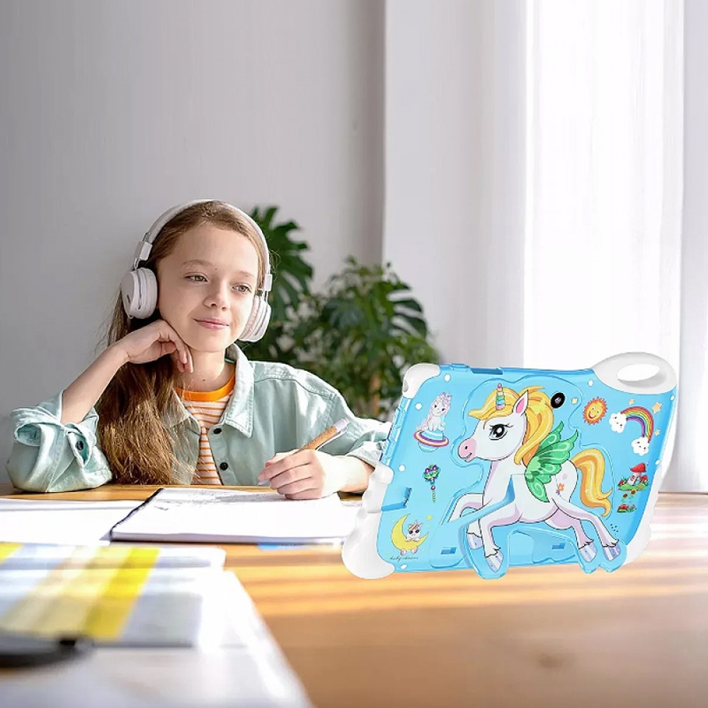 Tableta pentru copii 7" Android 12, 64 GB ROM, 4 GB RAM, Octa-core, Cameră dublă, 6000 mAh, Bluetooth, Fara SIM, Husa protecție EVA, Albastru cu unicorn.