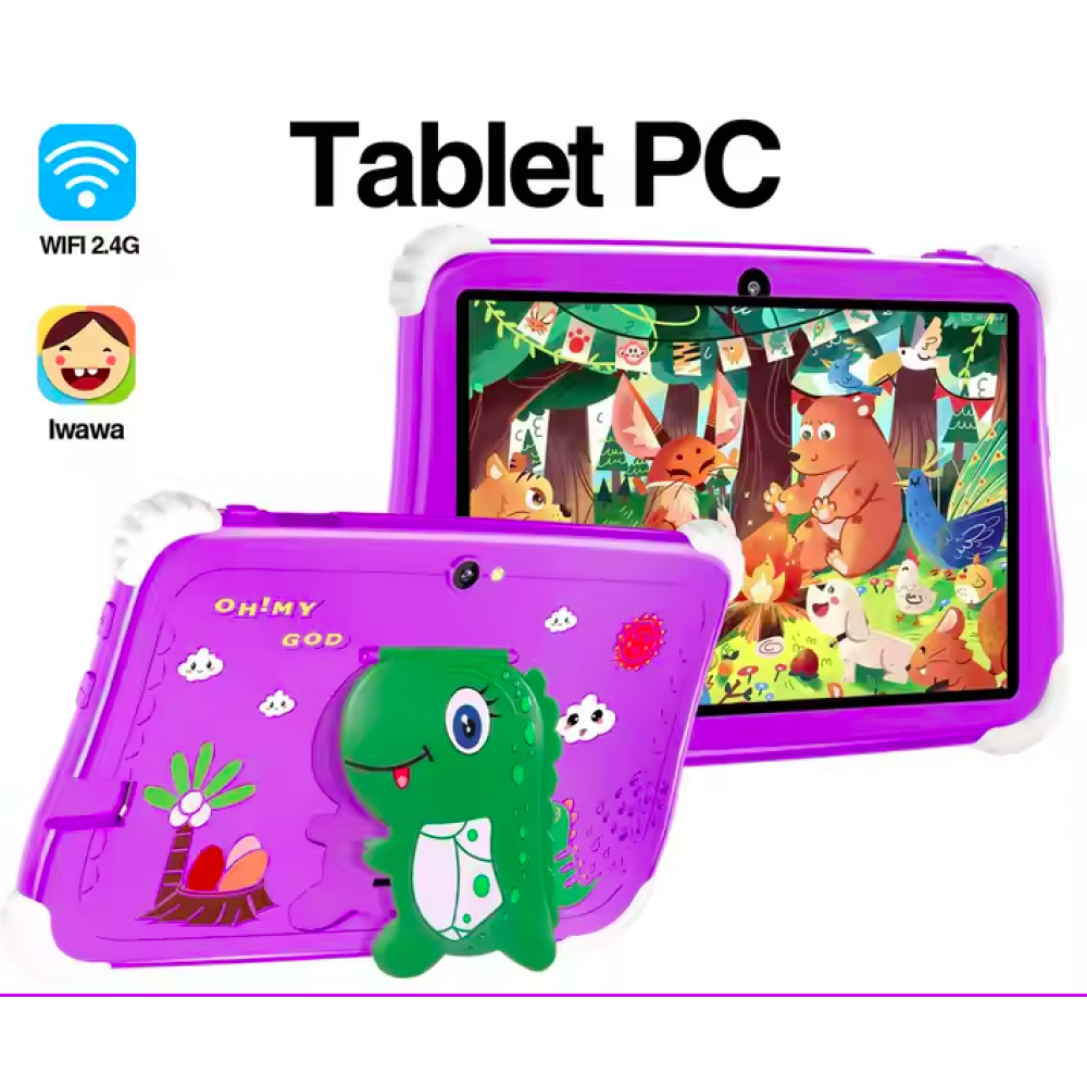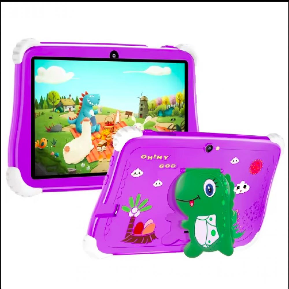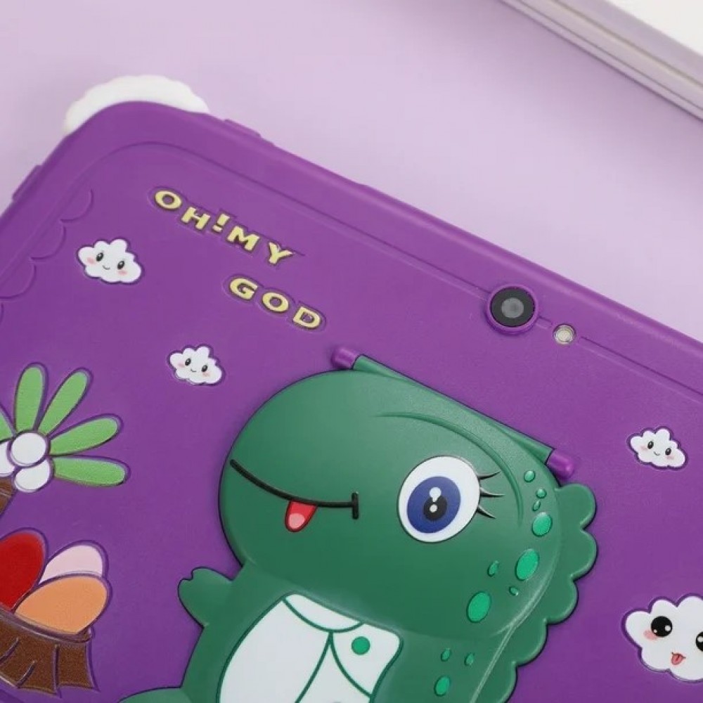 Tableta pentru copii 7" Android 12, 64 GB ROM, 4 GB RAM, Octa-core, Cameră dublă, 6000 mAh, Bluetooth, Fara SIM, Husa protecție EVA, Mov cu dinozaur.