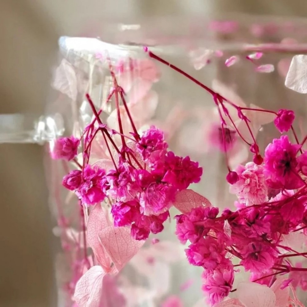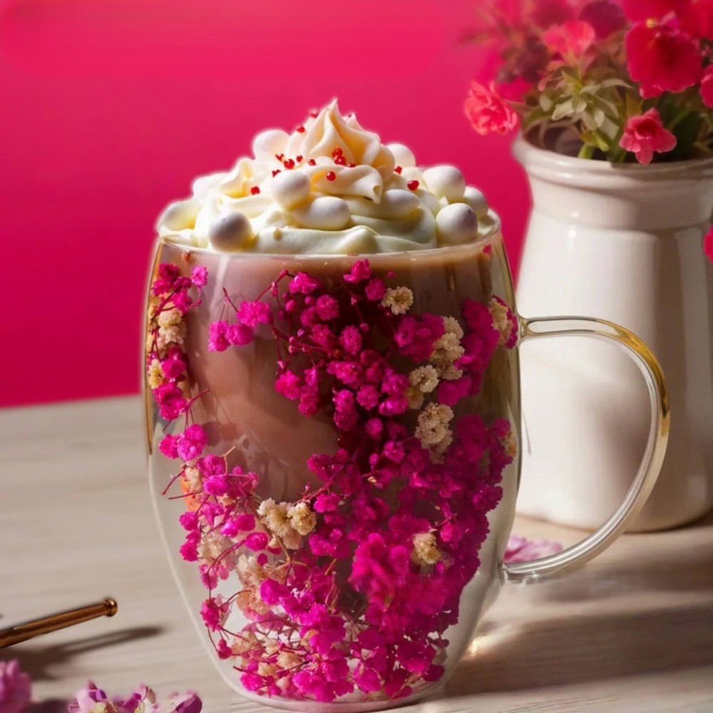 Cana cu flori uscate, perete dublu, sticla borosilicata, izolare termica, 250 ml, Roz intens