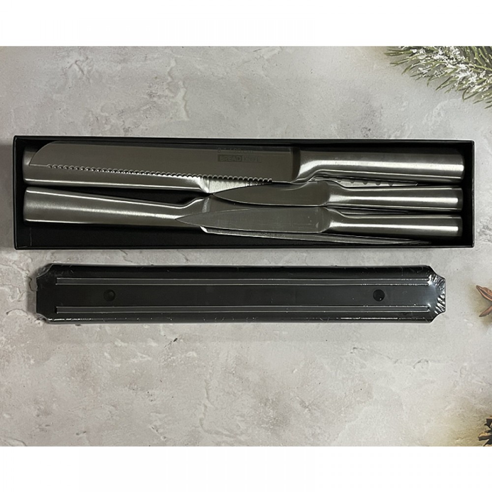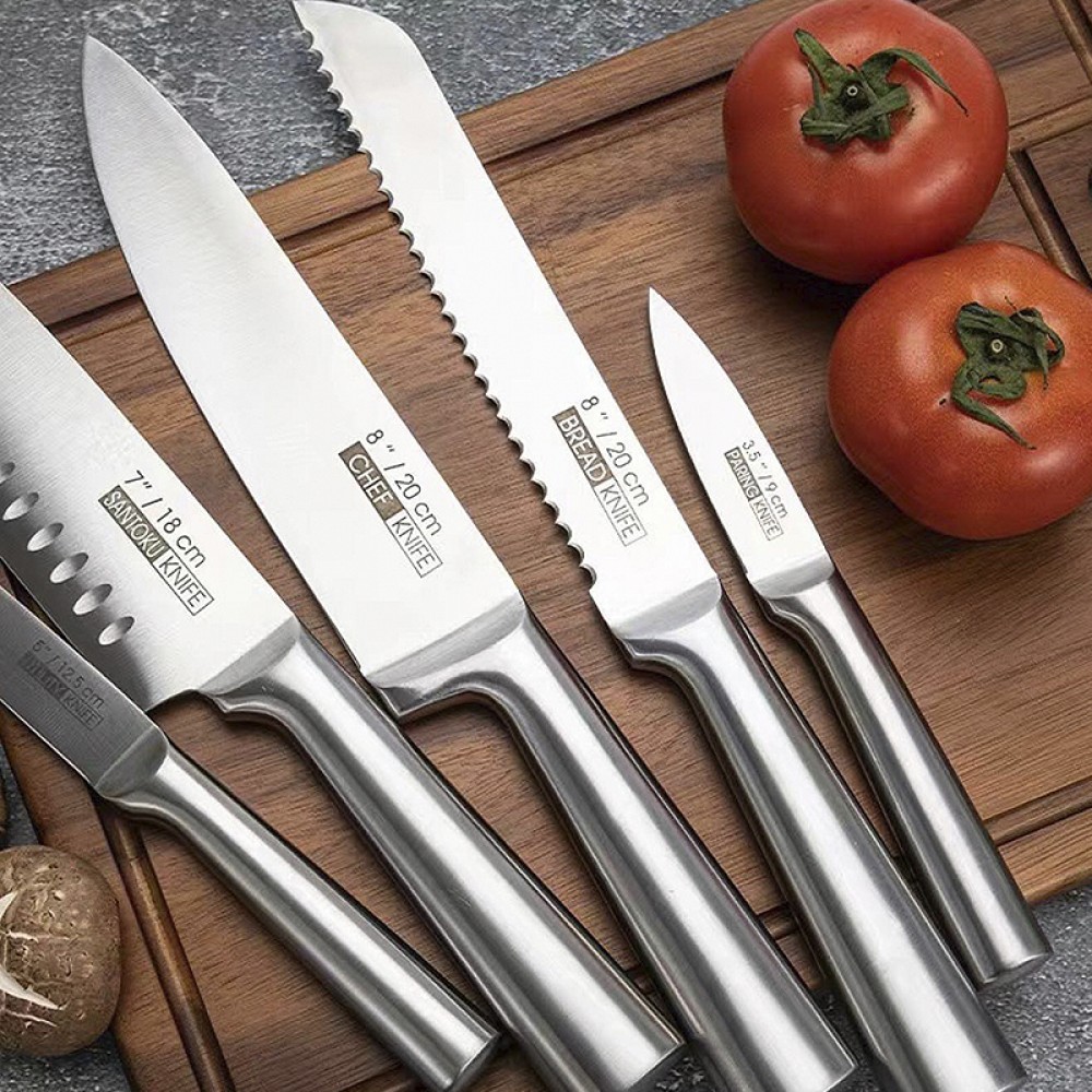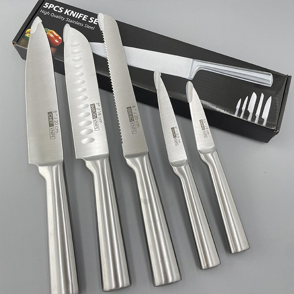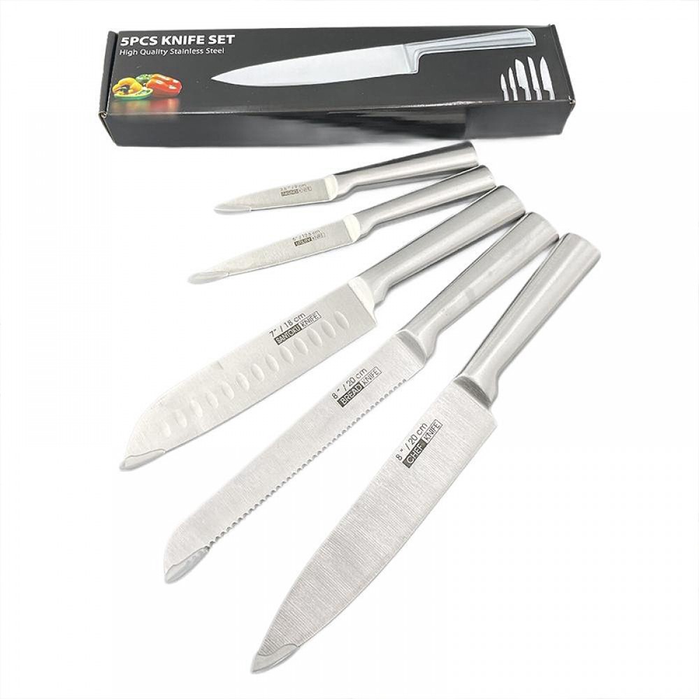 Acest set complet include 5 cuțite universale, fiecare creat pentru o sarcină specifică în bucătărie: cuțit chef, cuțit pentru pâine, santoku, cuțit universal și cuțit pentru curățare. Lamele sunt realizate din oțel inoxidabil de înaltă calitate, oferind durabilitate, rezistență la coroziune și tăiere ușoară a tuturor tipurilor de alimente – de la legume moi, la carne sau pâine cu coajă crocantă.