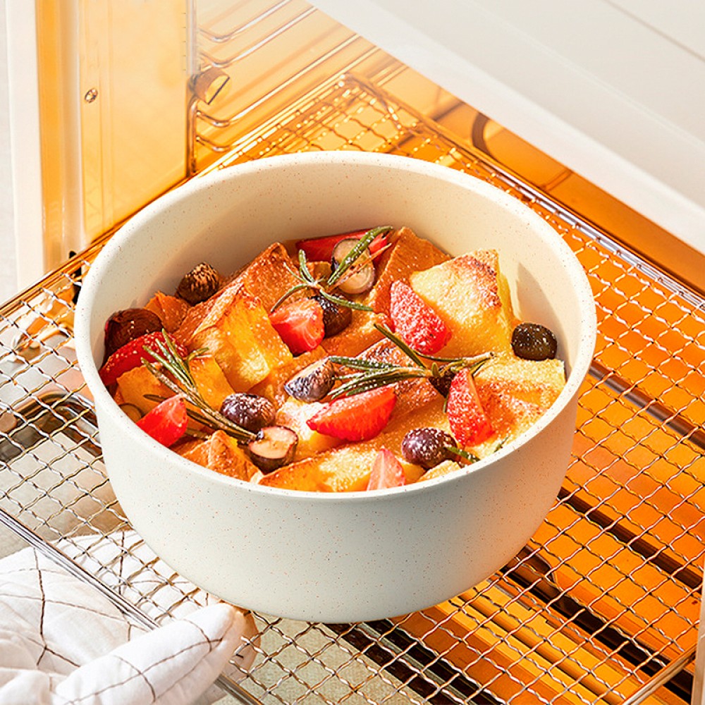 Acoperirea antiaderentă permite gătirea fără lipire și curățarea rapidă, iar designul elegant în alb lapte oferă un aspect rafinat bucătăriei tale. Setul este potrivit pentru uz zilnic și pentru prepararea unei game variate de feluri de mâncare, pe plită sau în cuptor.