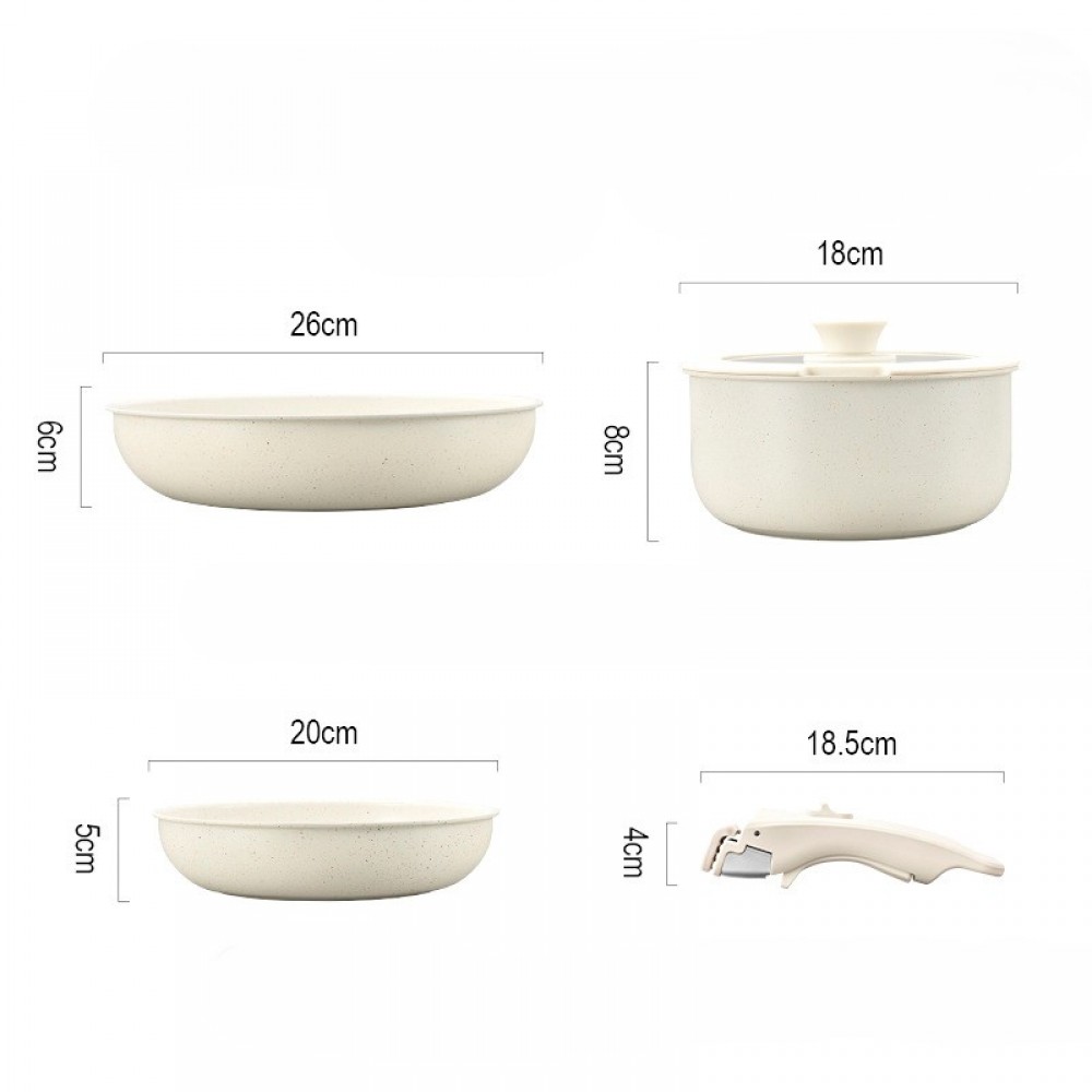 Set vase 5 piese: 2 tigăi + 1 cratiță + capac + mâner detașabil universal, alb laptos, antiaderent, pentru plită și cuptor