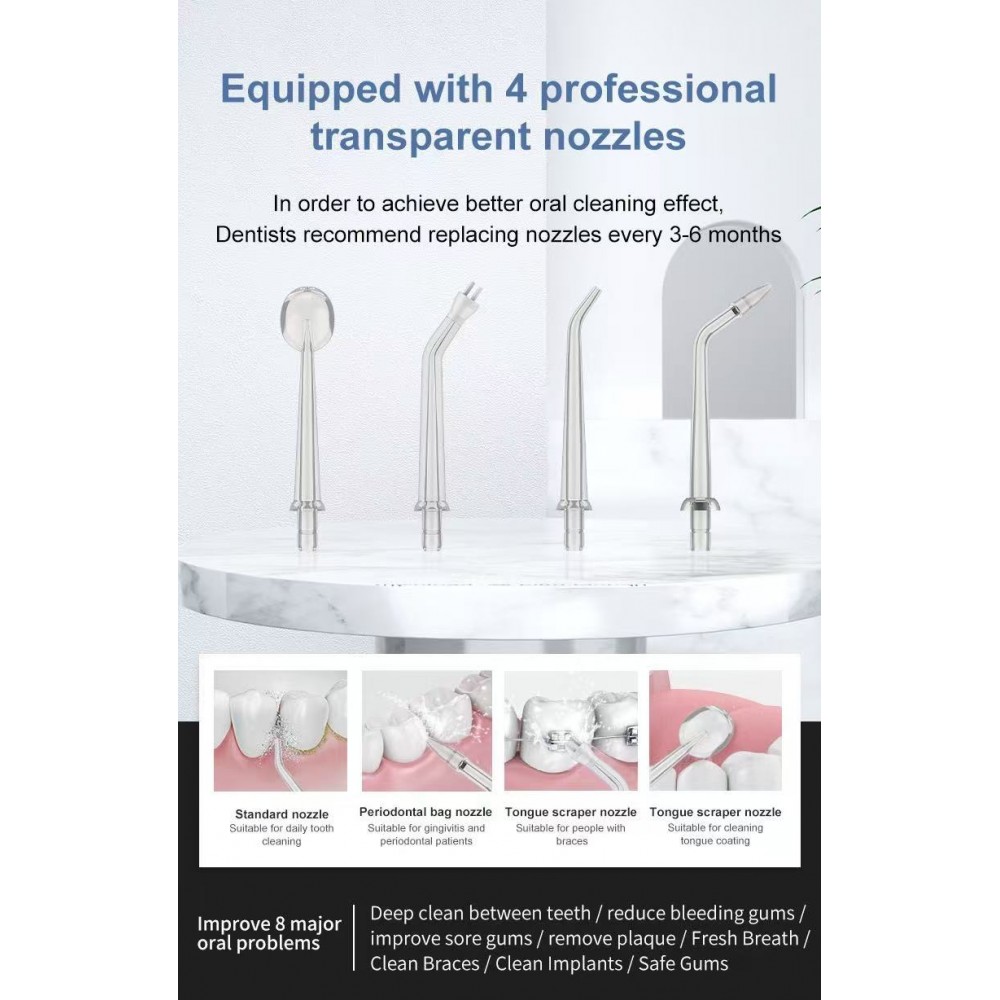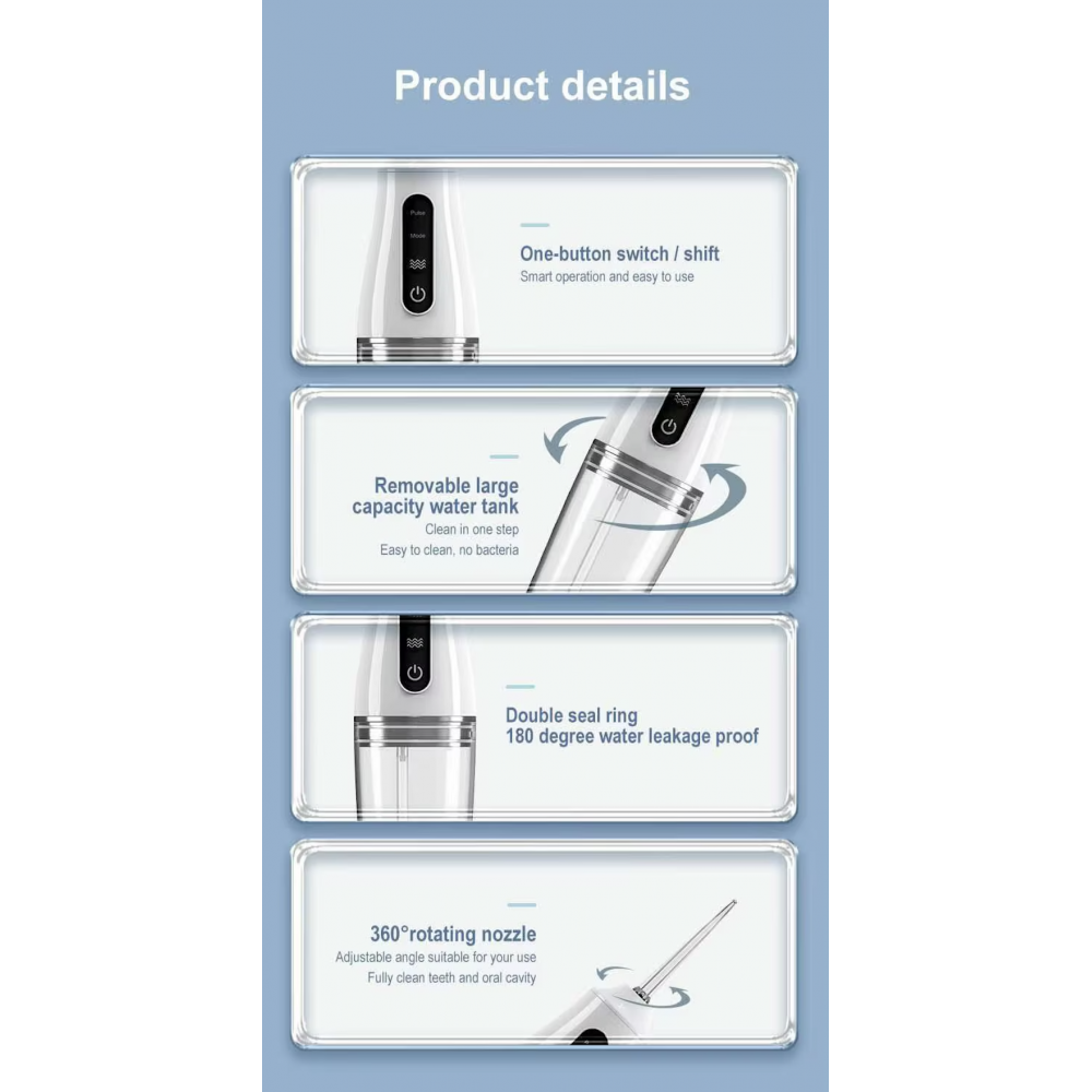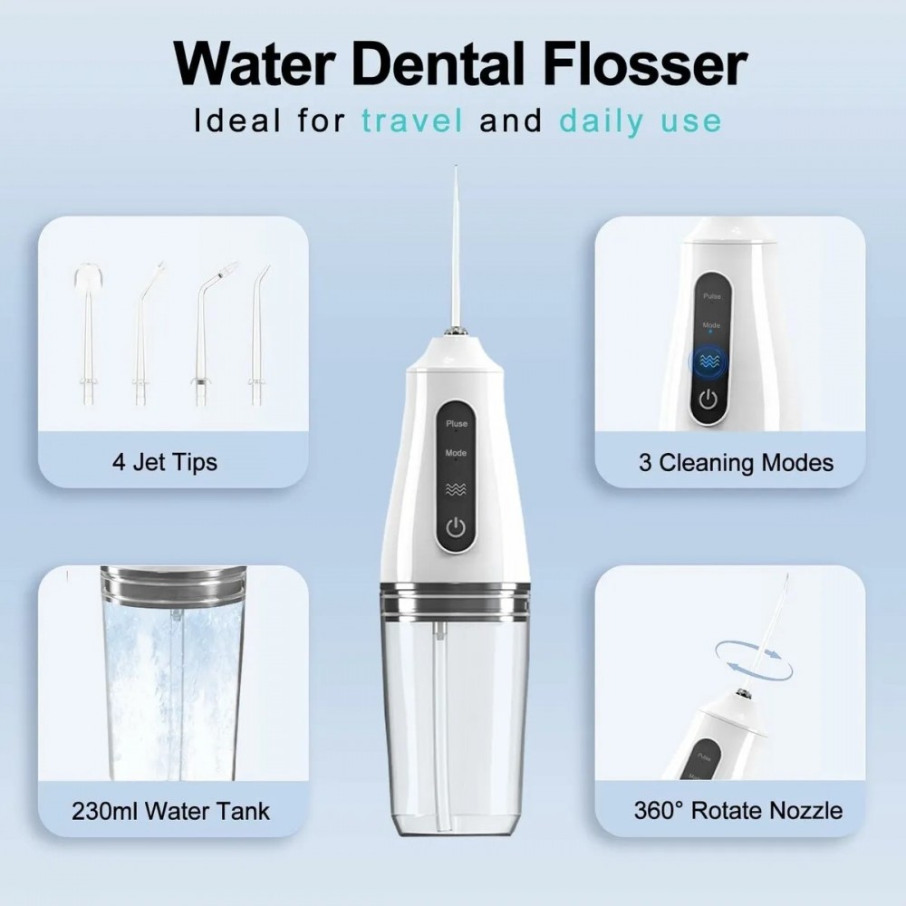 Irigator Oral Portabil – 4 Duze Specializate, 3 Moduri, Fără Fir, Reîncărcabil, Rezistent la Apă, Rezervor 230ml