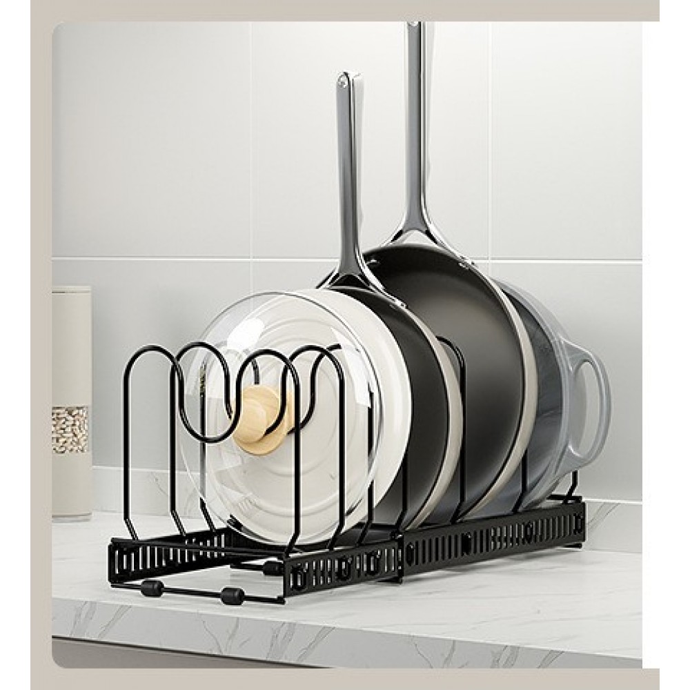 Suport telescopic negru pentru oale și tigăi, 10 suporturi, extensibil 30–58 cm – organizator practic pentru bucătărie
