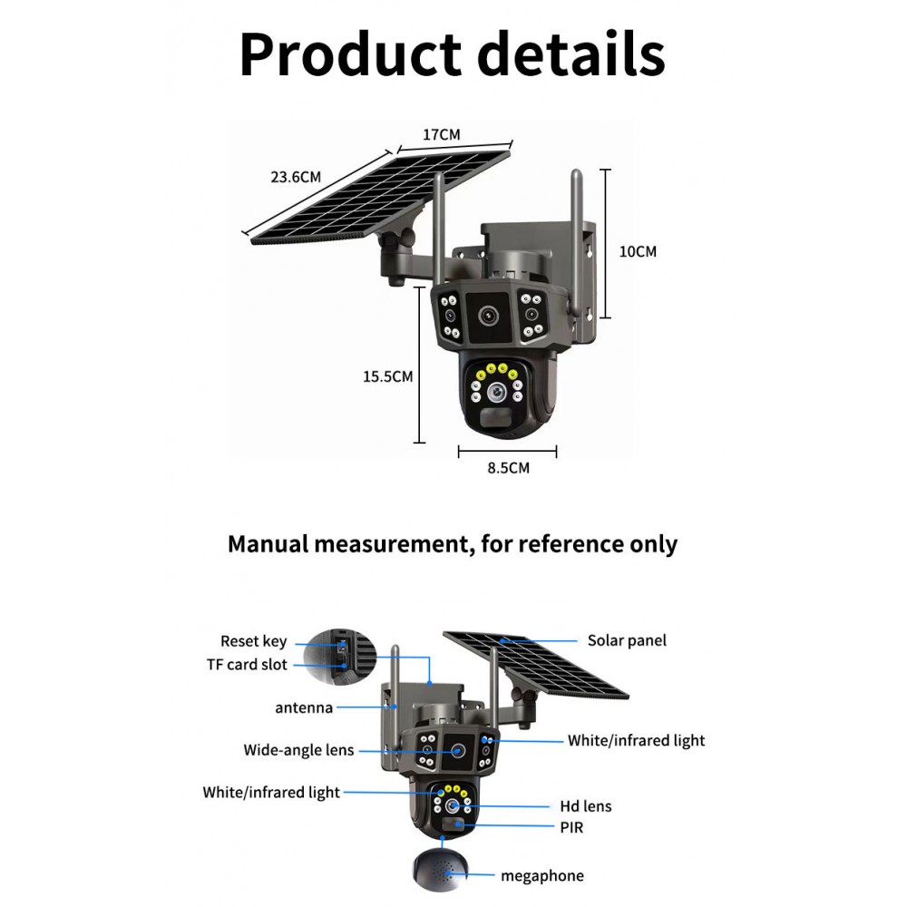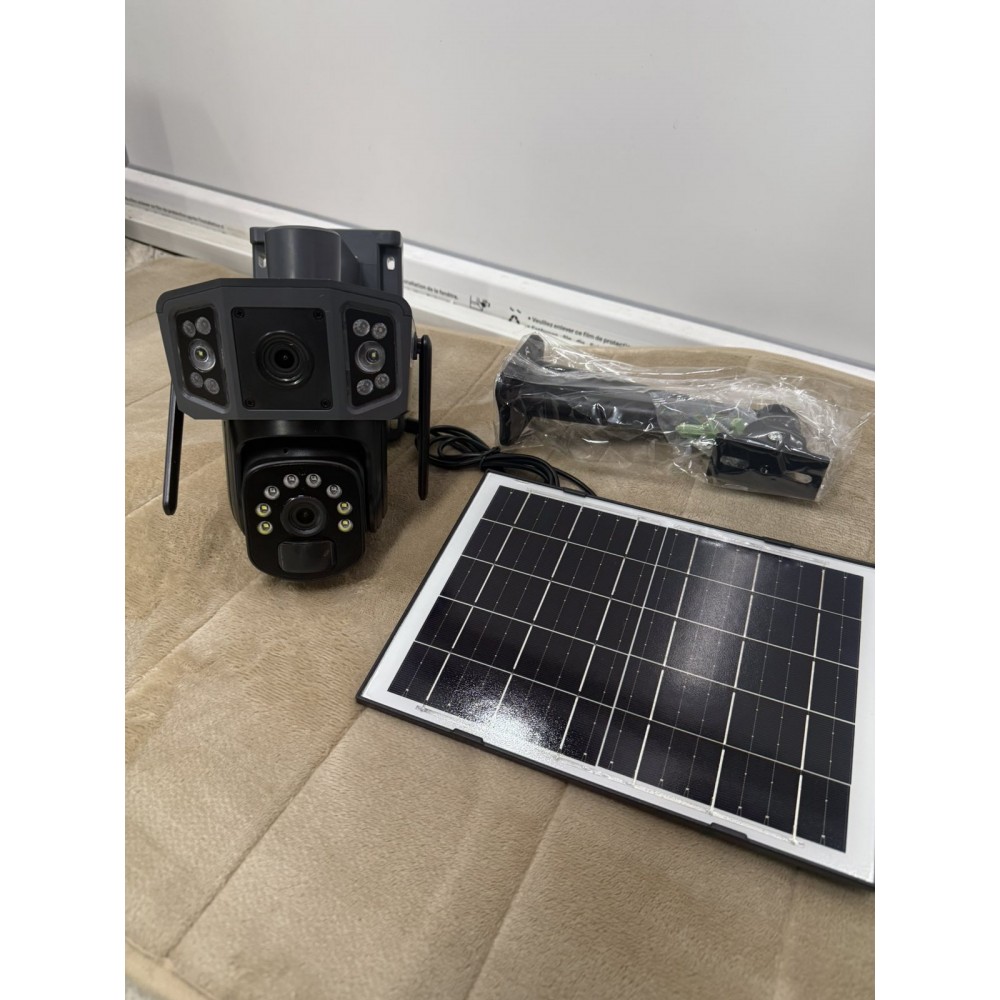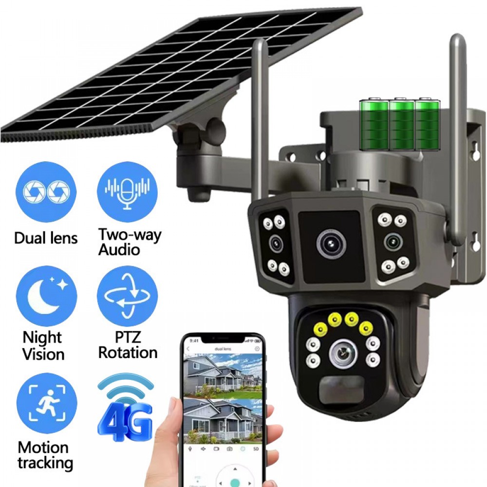 Cameră Supraveghere Solară 8MP, 4K – Dual Lens, PTZ 360°, Vedere Nocturnă Color, Detectare Umană AI, WiFi / 4G, IP66, Baterie 8000mAh, Fără Cabluri.