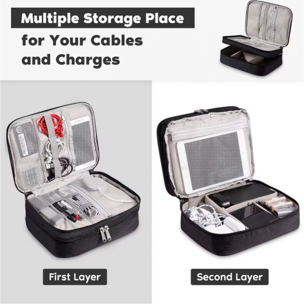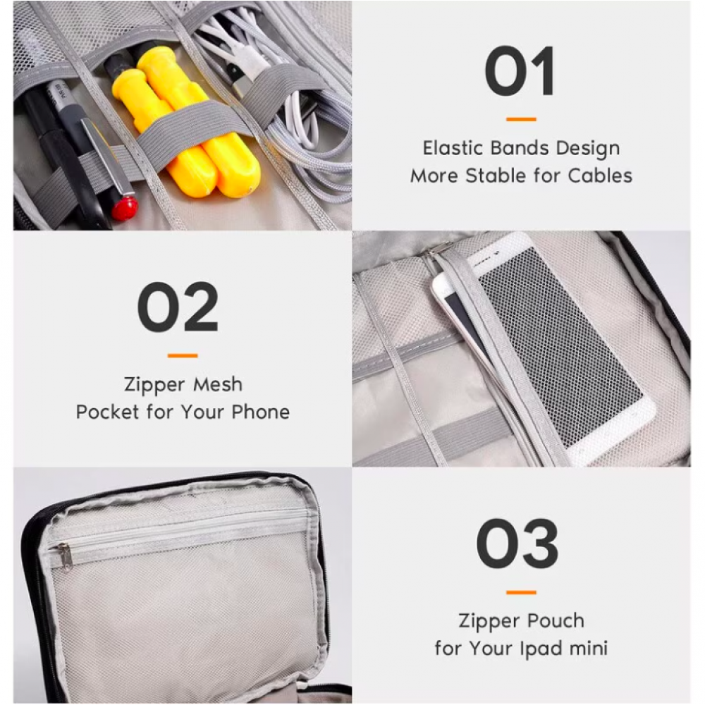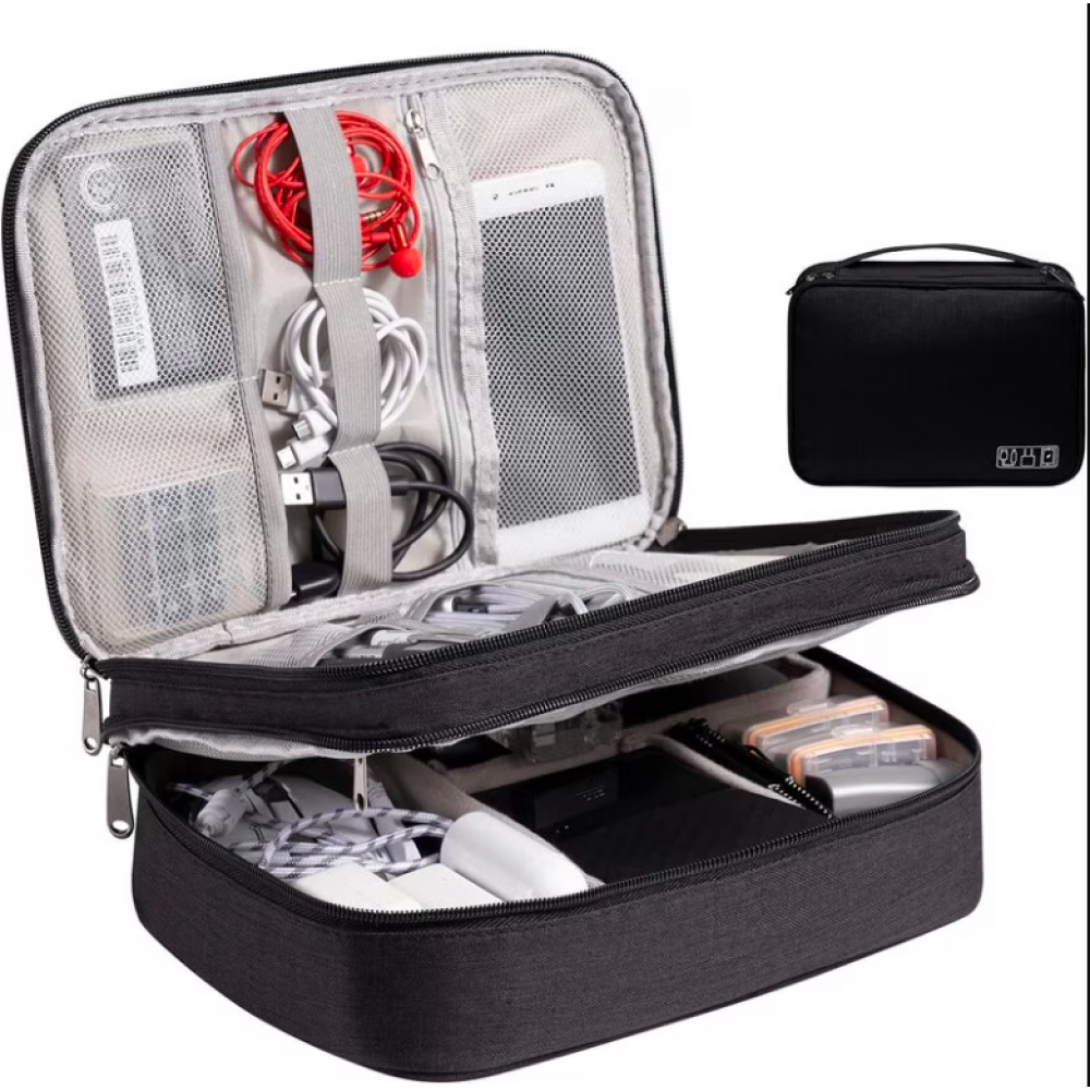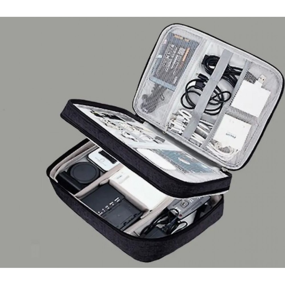 Organizatorul propus nu vă va permite doar să păstrați în ordine toate încărcătoarele, firele, unitățile flash, căștile, dar și să găsiți rapid și ușor articolul de care aveți nevoie. Este compact, dar în același timp încăpător. Constă din două secțiuni. Unul dintre ele (cel de jos) este destul de adânc și are partiții cu velcro care vă permit să organizați depozitarea după alegerea dvs. Puteți plasa o bancă de alimentare, un splitter etc. Cele două părți ale compartimentului superior al organizatorului sunt împărțite în compartimente de depozitare cu benzi elastice pentru o mai bună fixare a articolelor închise. Potrivit pentru depozitarea tabletelor, încărcătoarelor, căștilor. Materialul organizatorului are proprietăți hidrofuge, materialul este rezistent la uzură, deformare, rupere și abraziuni. Protejează conținutul de umiditate și praf. Produsul este prins cu fermoar și are un mâner pentru transport ușor. Aceasta geanta de voiaj va fi utila atat acasa cat si in calatorie, in vacanta sau intr-o calatorie de afaceri.