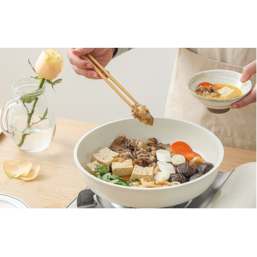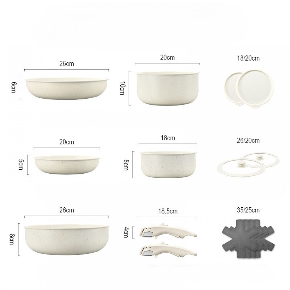 Acest set complet de 15 piese este alegerea ideală pentru o bucătărie modernă și practică, oferind flexibilitate maximă în gătit, depozitare și servire. Piesele sunt concepute cu un design elegant alb lapte și dotate cu un strat antiaderent avansat si rezistenta la temperaturi extreme, care permite gătirea uniformă fără lipire și o curățare rapidă.